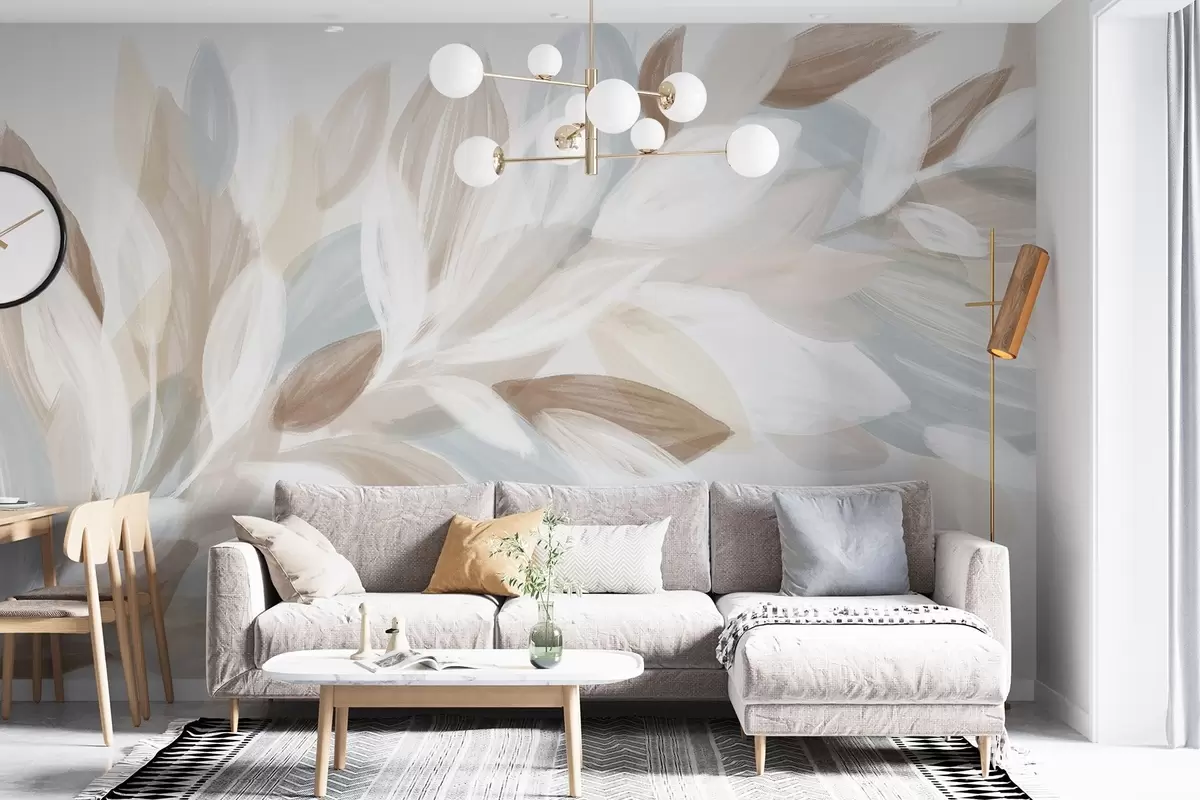 Fotomurales Suaves hojas de colores pastel en tonos blanco, beige y azul claro, que crean una composición delicada y etérea Nr. w08649