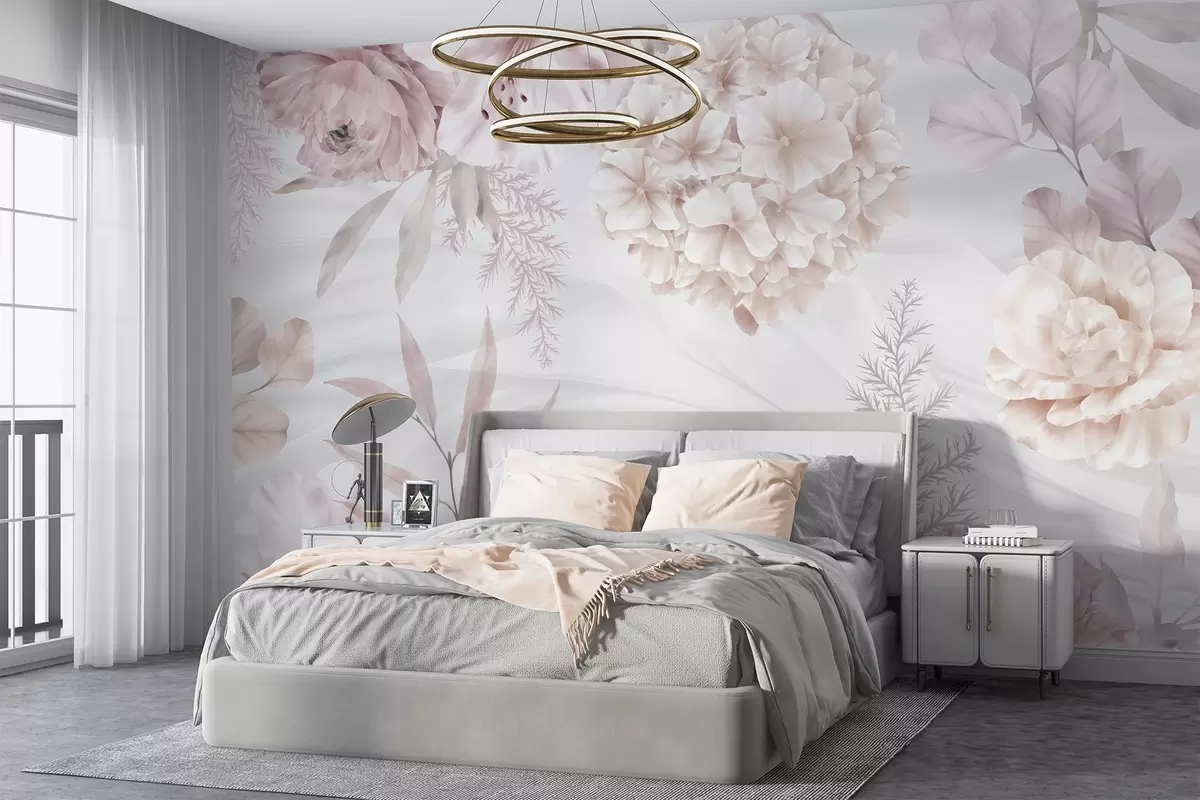 Fotomurales Un estampado floral suave y abstracto con grandes flores rosas y blancas, delicadas hojas y una paleta de colores pastel apagados Nr. w08651