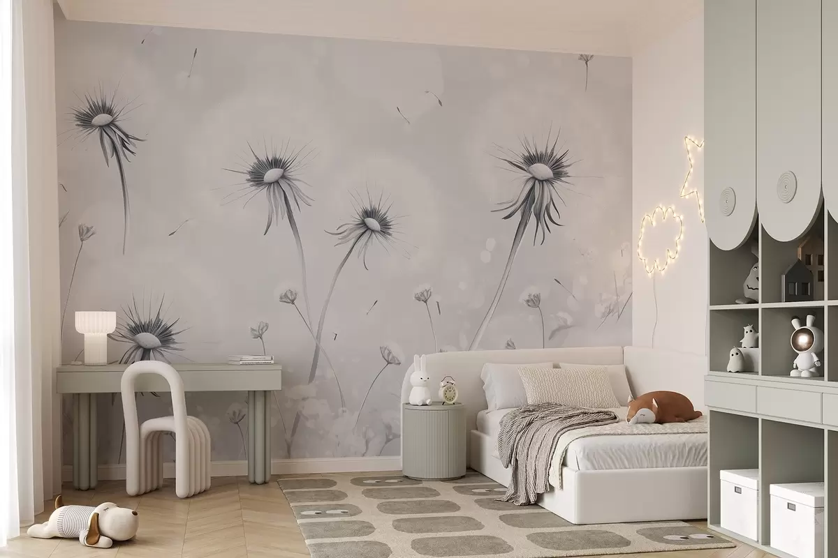 Fotomurales Elegantes dientes de león y flores silvestres en estilo pictórico en tonos azules Nr. w08657v2