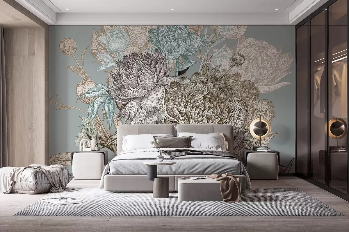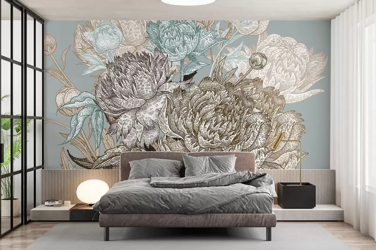 Fotomurales Un detallado diseño de líneas florales con grandes peonías y hojas en tonos azules, beige y marrón Nr. w08663