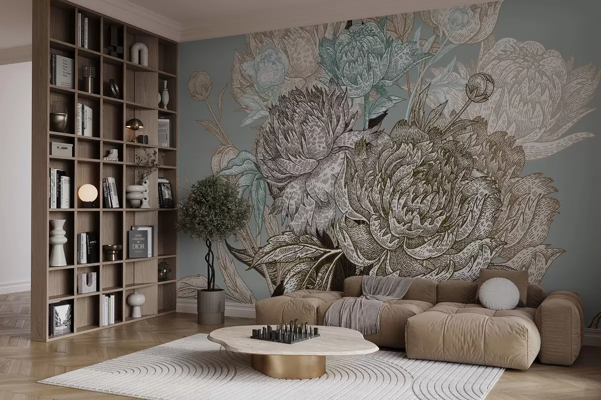 Fotomurales Un detallado diseño de líneas florales con grandes peonías y hojas en tonos azules, beige y marrón Nr. w08663