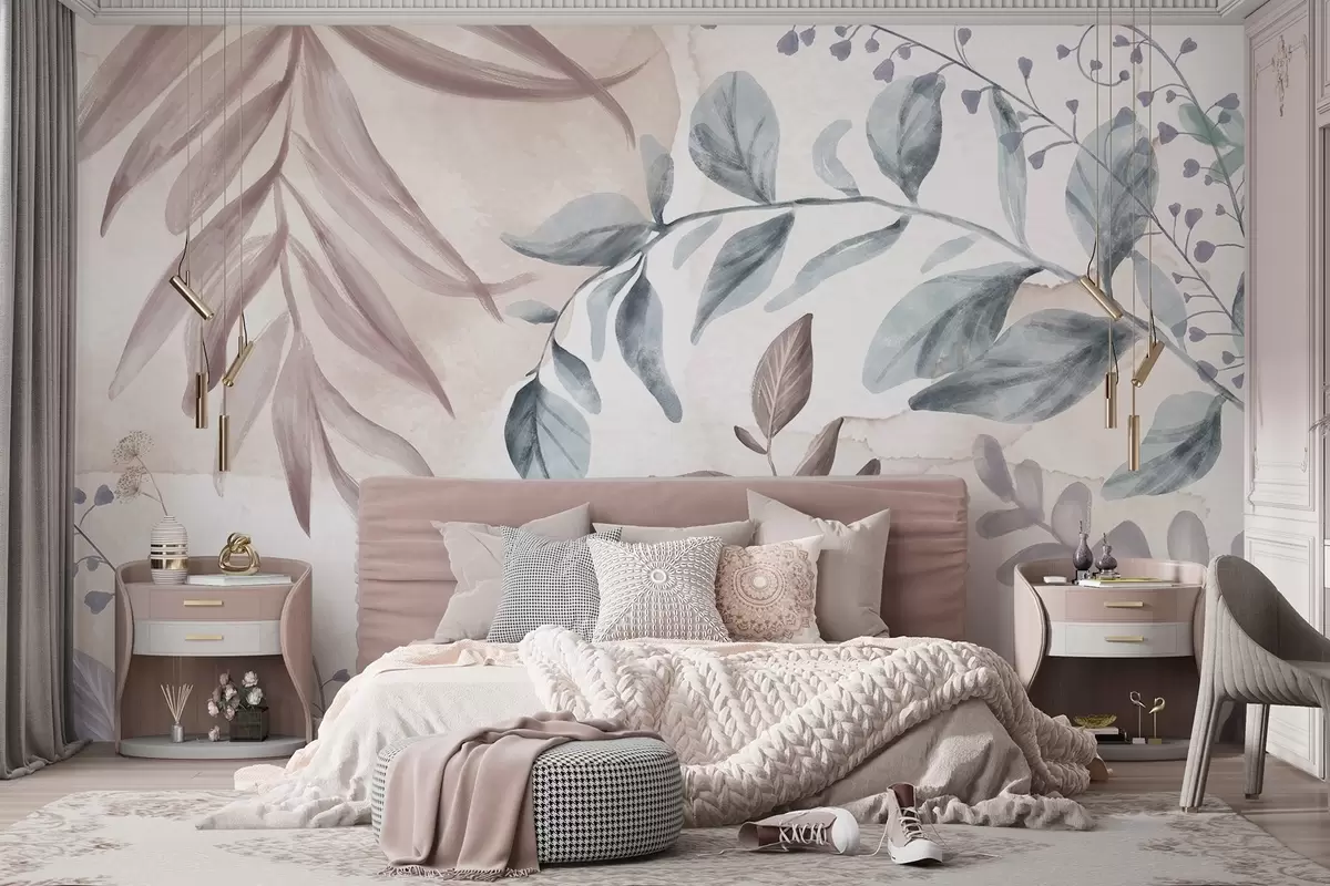 Fotomurales Estampado botánico con hojas y ramas florales en suaves colores pastel, sobre fondo de acuarela Nr. w08668
