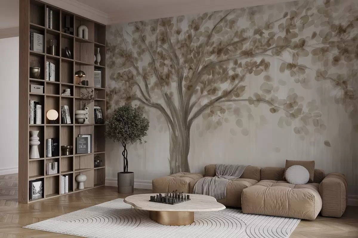 Fotomurales Un gran árbol con hojas suaves y abstractas de color beige sobre un fondo claro y neutro que realza los tonos del árbol Nr. w08669