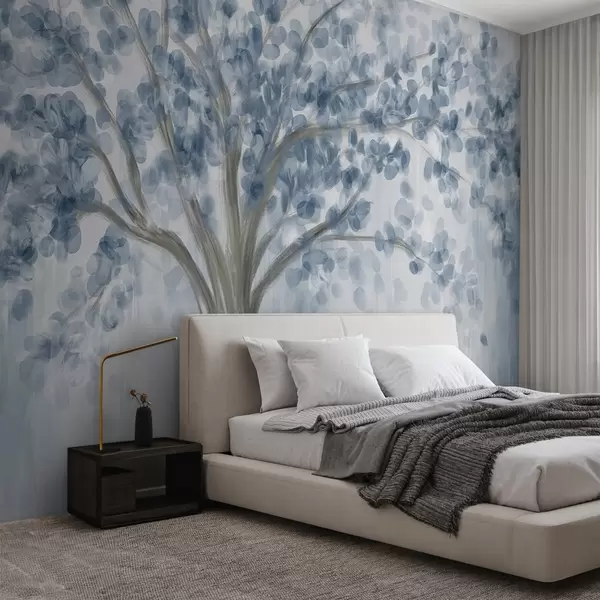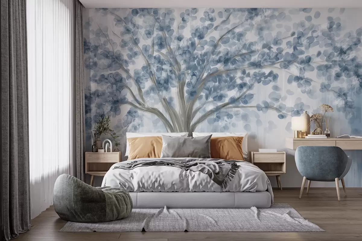 Fotomurales Un gran árbol con hojas suaves y abstractas en azul sobre un fondo claro y neutro que realza los tonos del árbol Nr. w08669v1
