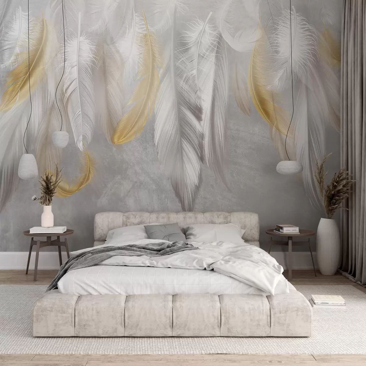 Fotomurales Plumas blancas y amarillas que cuelgan sobre un fondo gris suave, creando una composición delicada y aérea Nr. w08670