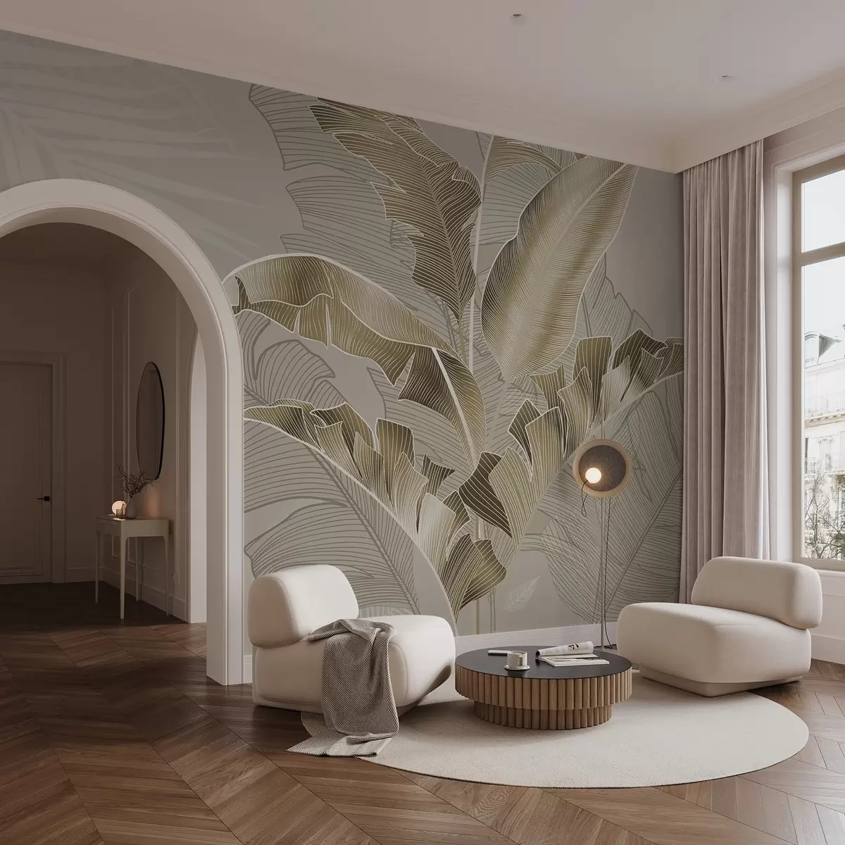Fotomurales Una armoniosa composición de hojas tropicales en tonos beige y marrón, con un detallado trabajo de líneas Nr. w08698