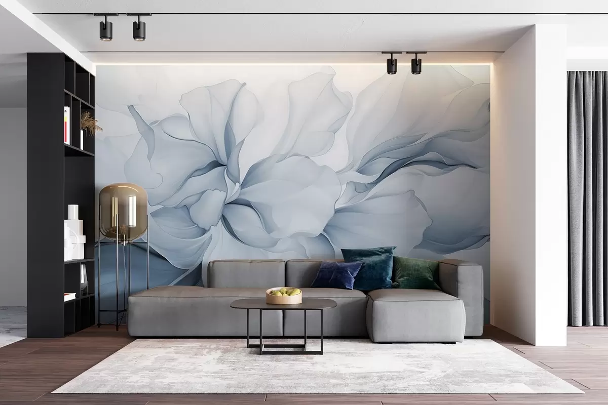 Fotomurales Pétalos florales abstractos fluidos de formas translúcidas y estratificadas en colores pastel, en tonos azules Nr. w08701v2