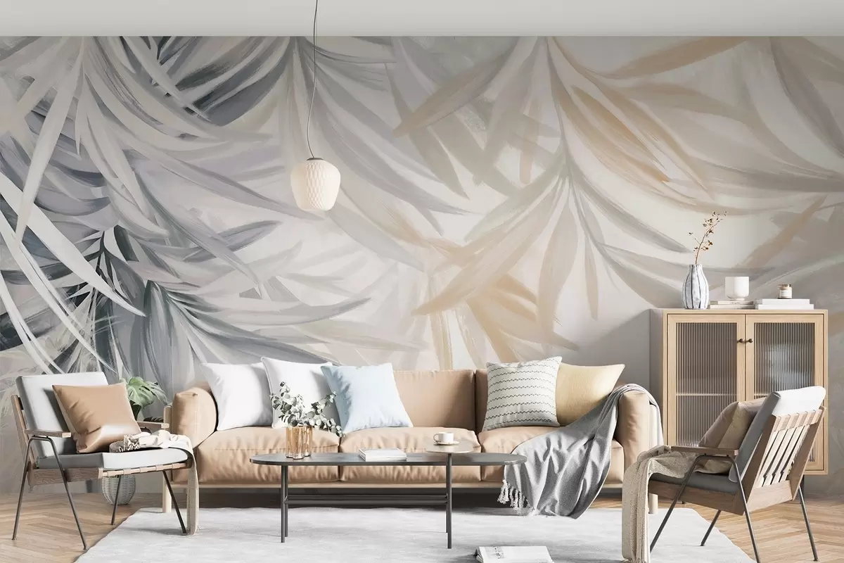 Fotomurales Suaves y fluidas hojas tropicales de color claro en tonos grises y melocotón, que se funden en un estampado pálido y neutro Nr. w08703