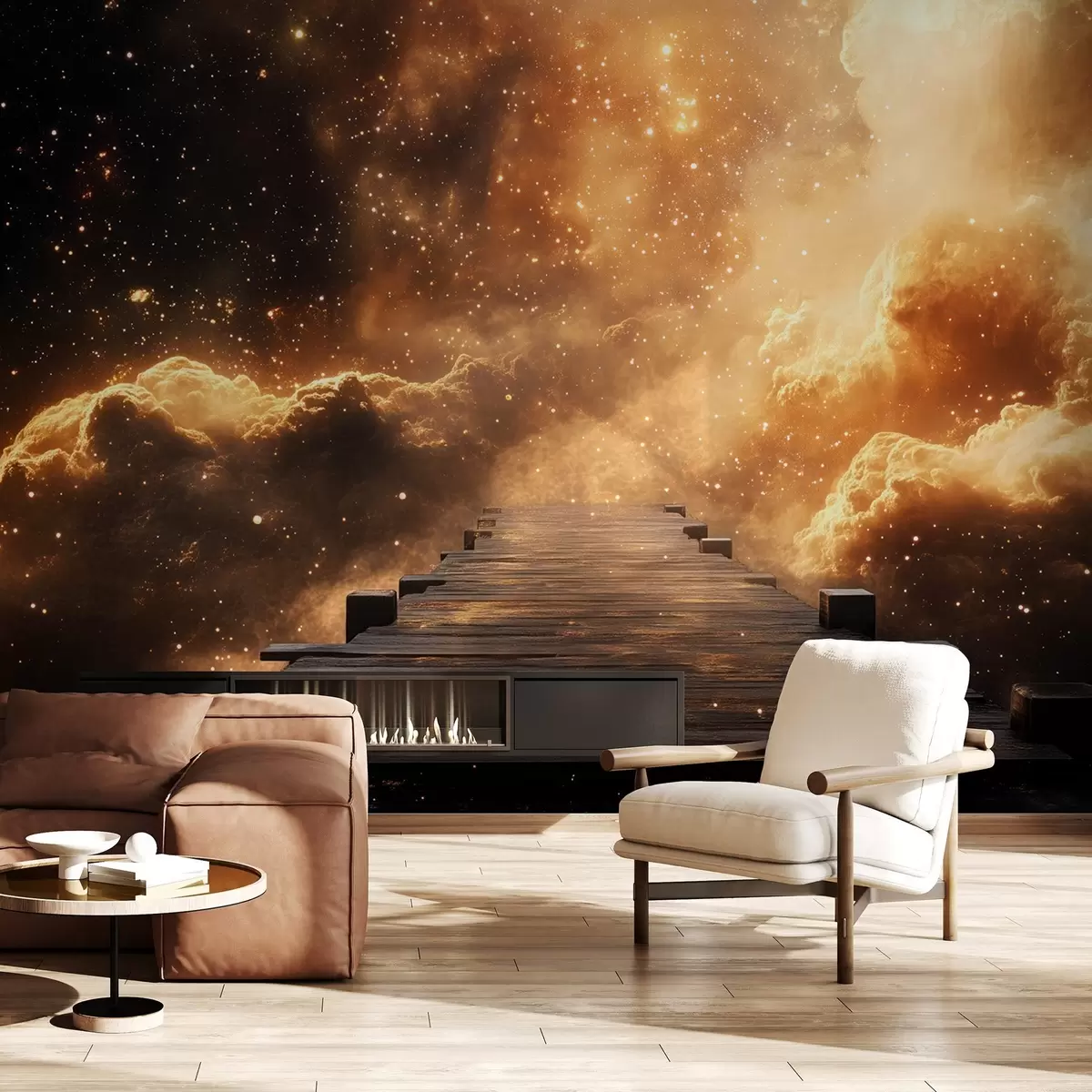 Fotomurales Cielo cósmico estrellado amarillo-negro con un muelle de madera Nr. w08723
