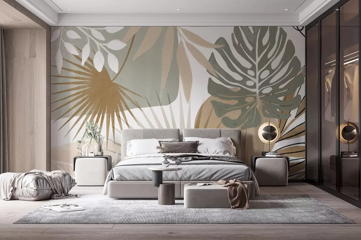 Fotomurales Diseño abstracto con varias hojas tropicales en tonos tierra, verde, beige y crema Nr. w08738v1