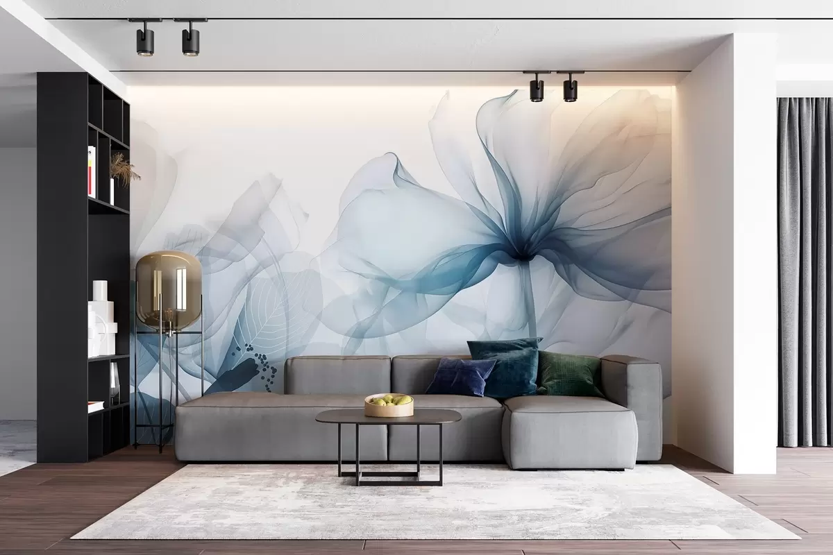 Fotomurales Flores abstractas azules con suaves pétalos translúcidos y delicados detalles, sobre fondo blanco Nr. w08742