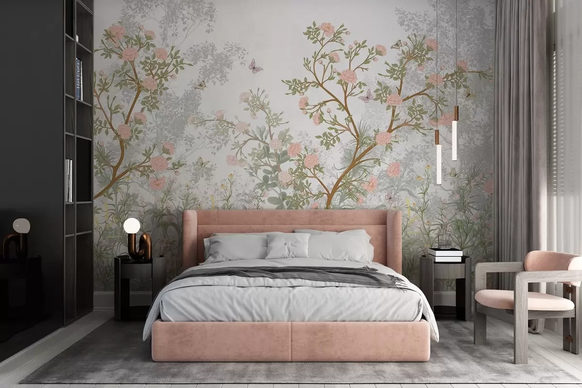 Fotomurales Delicados árboles en flor de color rosa, mariposas voladoras y hojas verdes entrelazadas con esbeltas ramas Nr. w08744