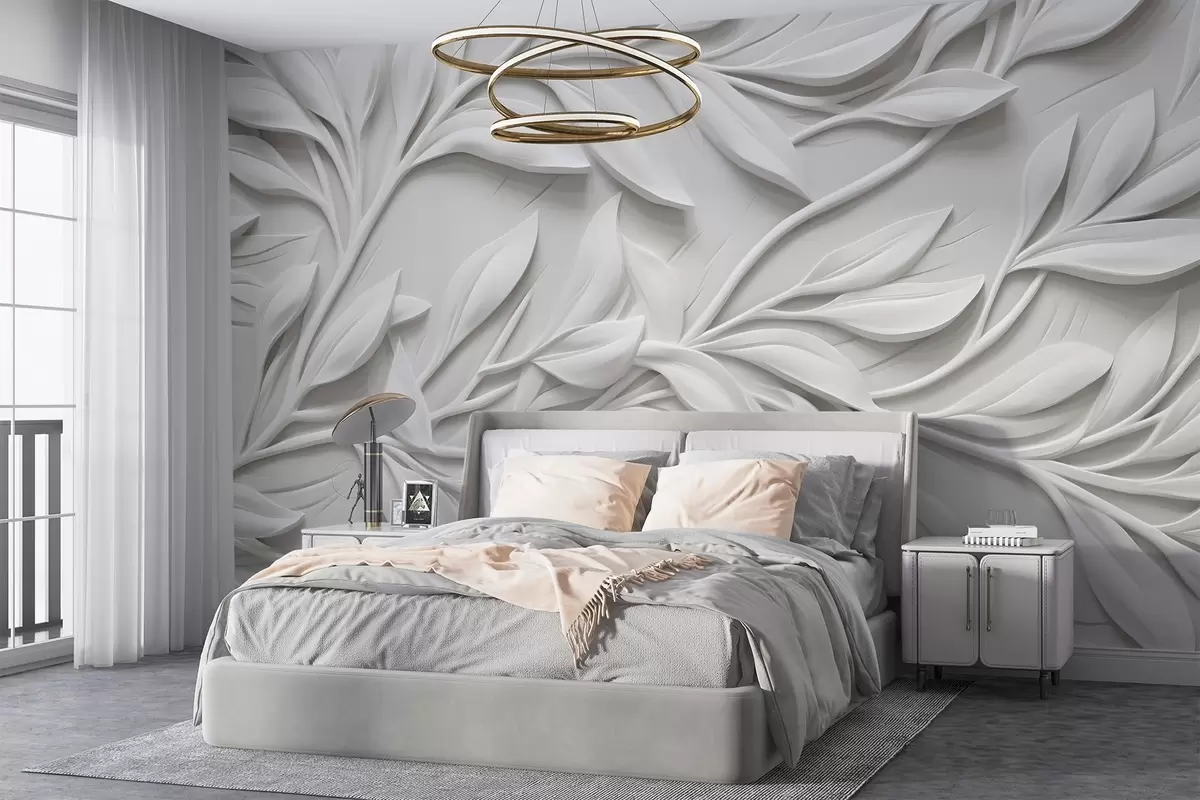 Fotomurales Estampado blanco texturizado con hojas y ramas , creando un efecto de imitación de volumen sobre un fondo texturizado Nr. w08778