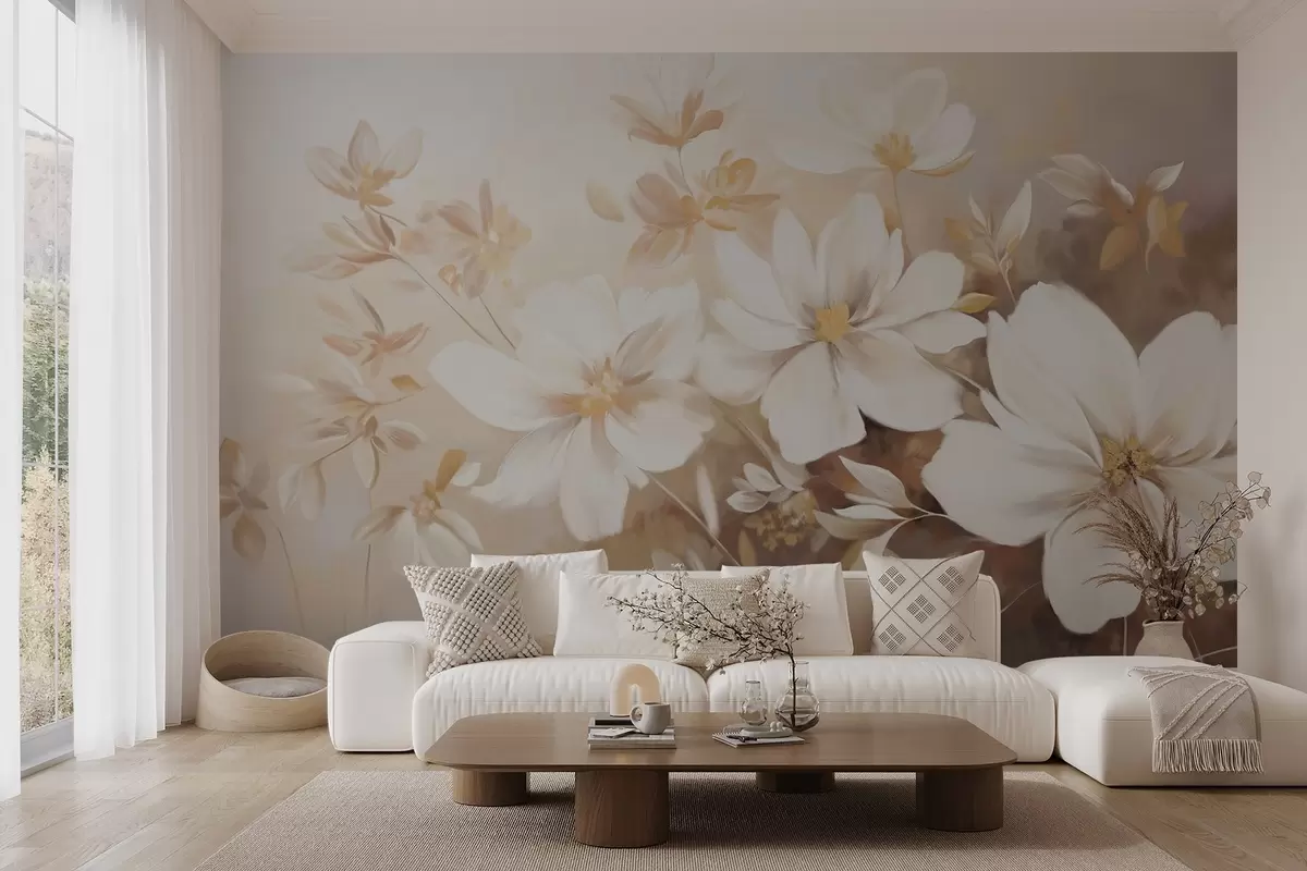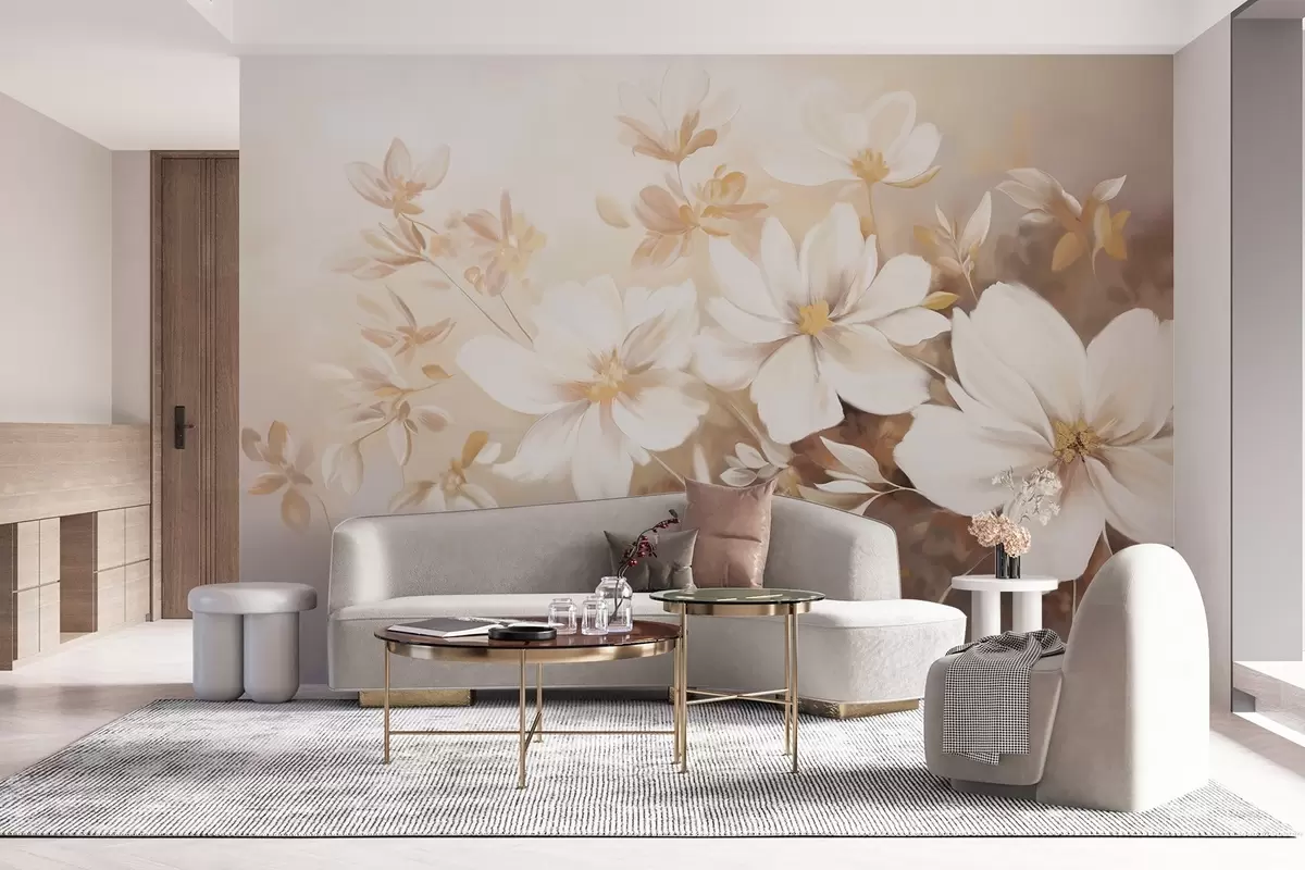 Fotomurales Flores pintadas de blanco con suaves pétalos y delicadas hojas, sobre un fondo beige claro y crema Nr. w08780