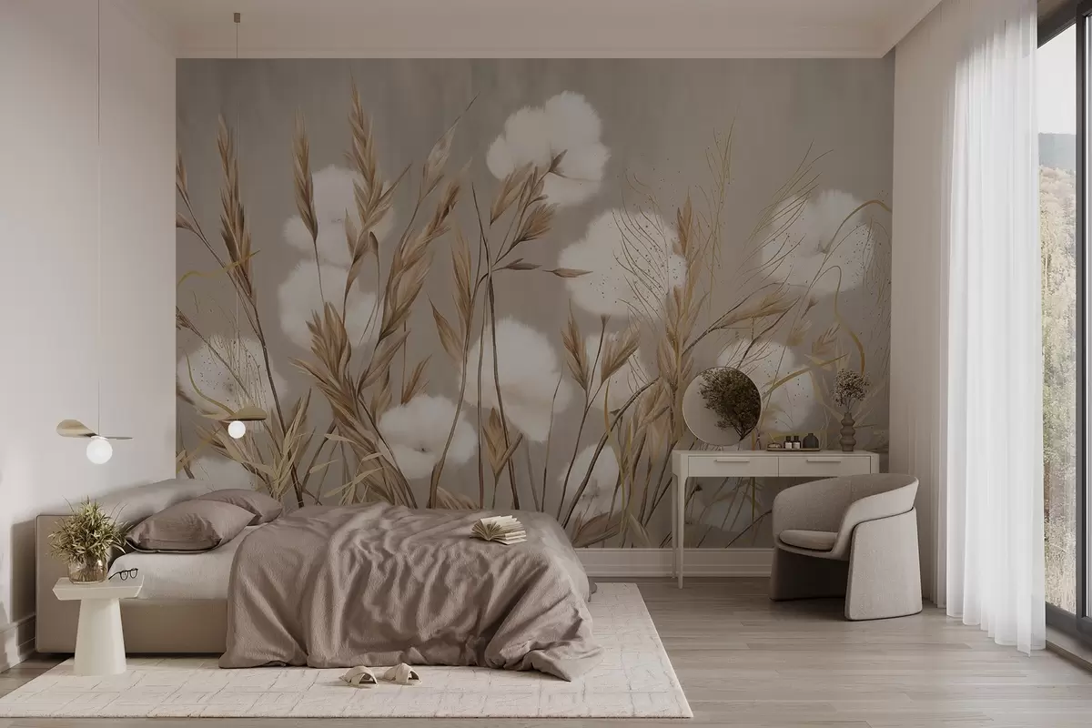 Fotomurales Flores blancas de algodón suave y esponjoso y altas espiguillas de hierba anaranjadas sobre un fondo beige de textura apagada Nr. w08784