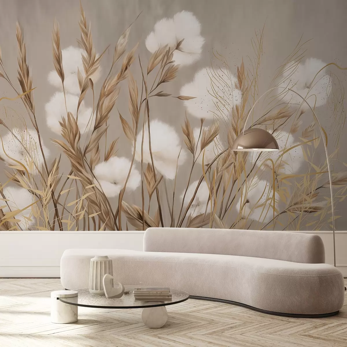 Fotomurales Flores blancas de algodón suave y esponjoso y altas espiguillas de hierba anaranjadas sobre un fondo beige de textura apagada Nr. w08784