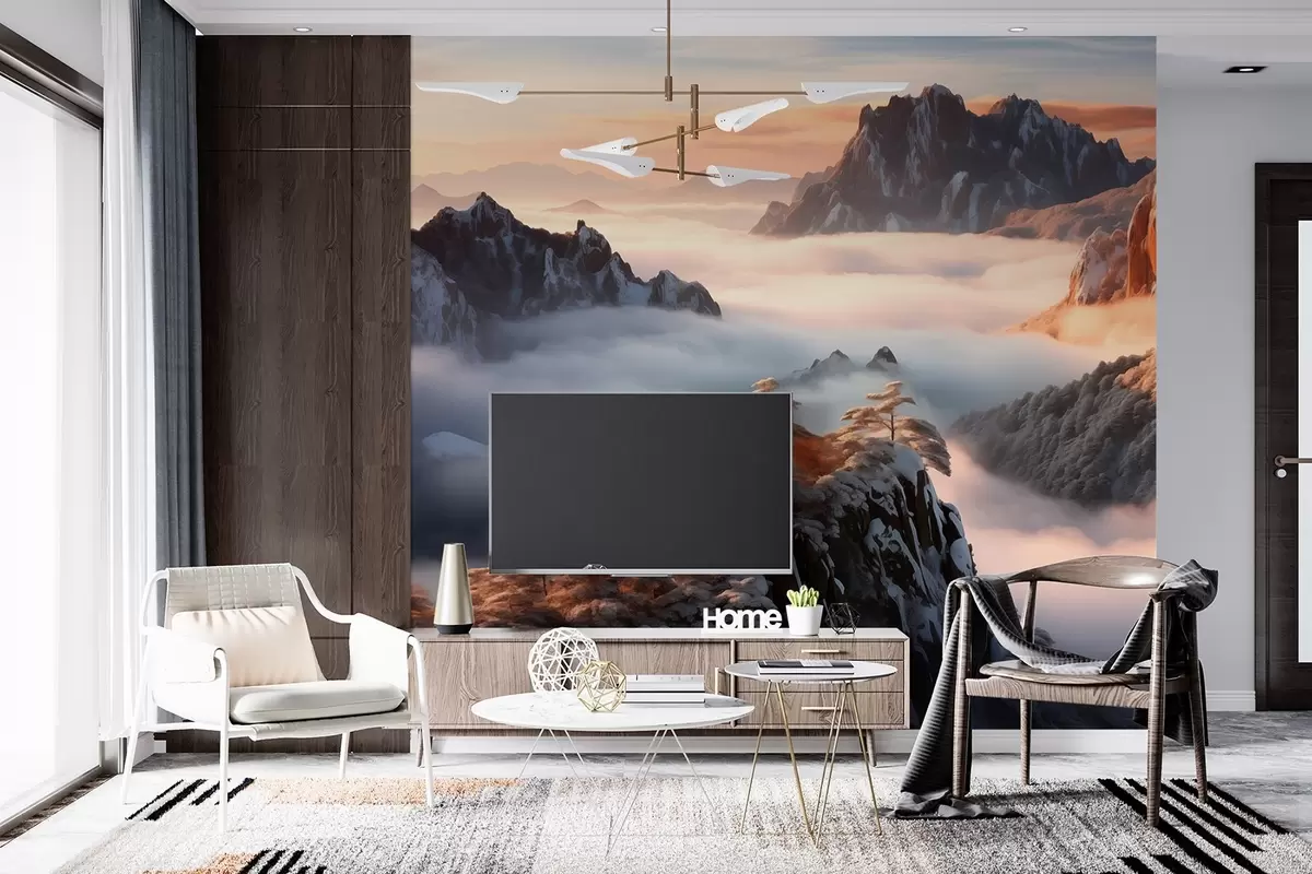 Fotomurales Encantador paisaje de montaña con niebla y árboles Nr. w08807