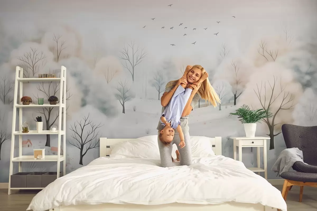 Fotomurales Bosque invernal con árboles, casitas, pájaros y nieve en estilo acuarela ligera Nr. w08815