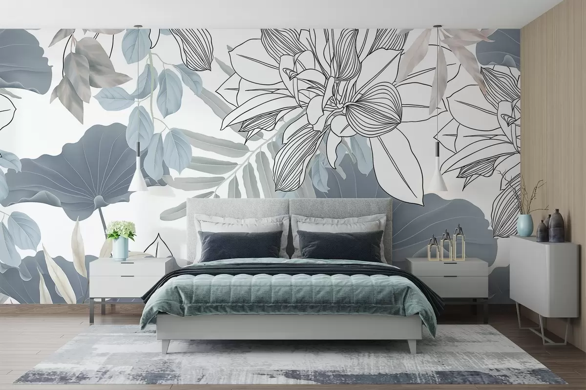 Fotomurales Estampado floral con flores y hojas de loto en azul y blanco sobre fondo blanco Nr. w08827