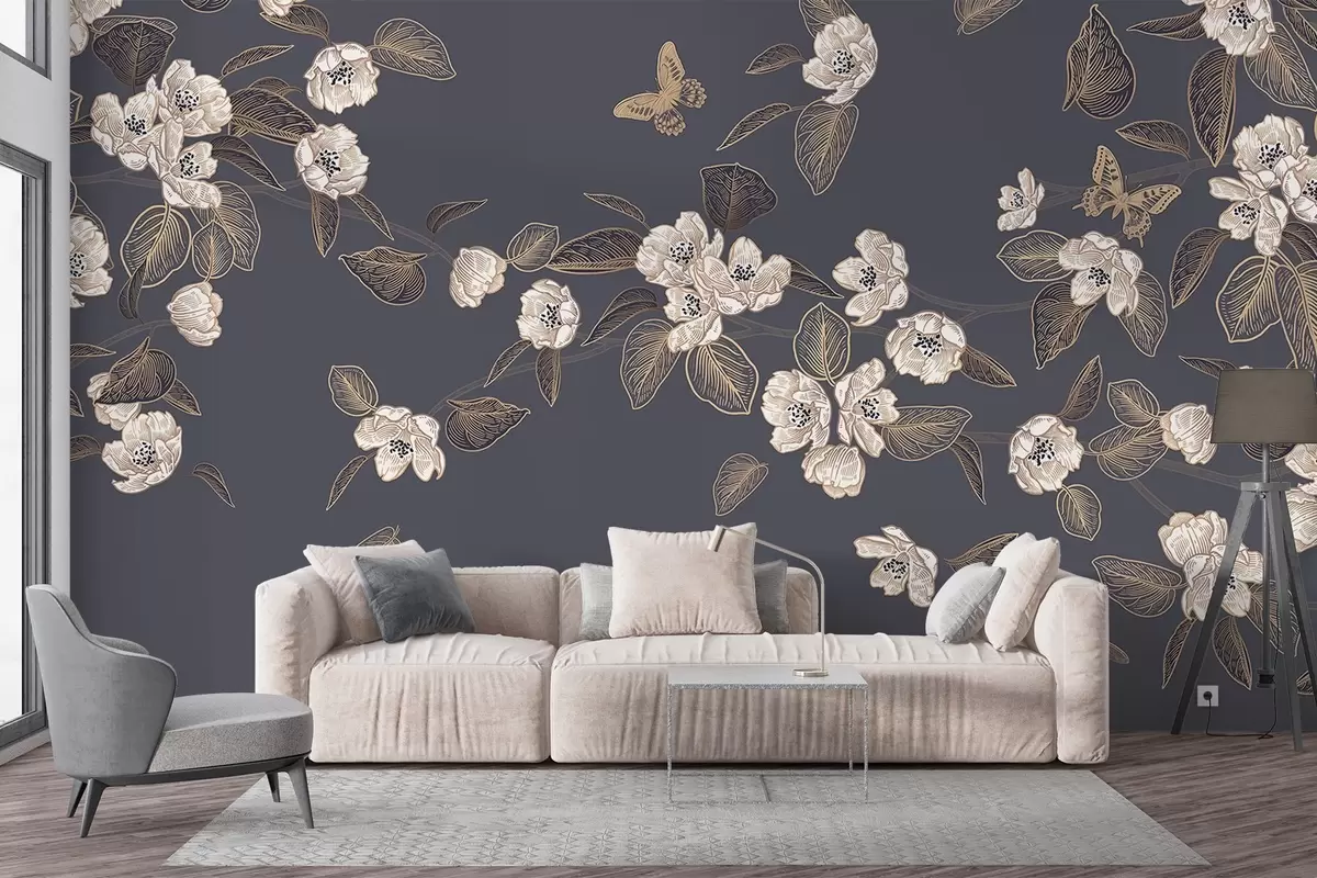 Fotomurales Flor de cerezo rama con flores, hojas, mariposas sobre un fondo gris oscuro Nr. w08830