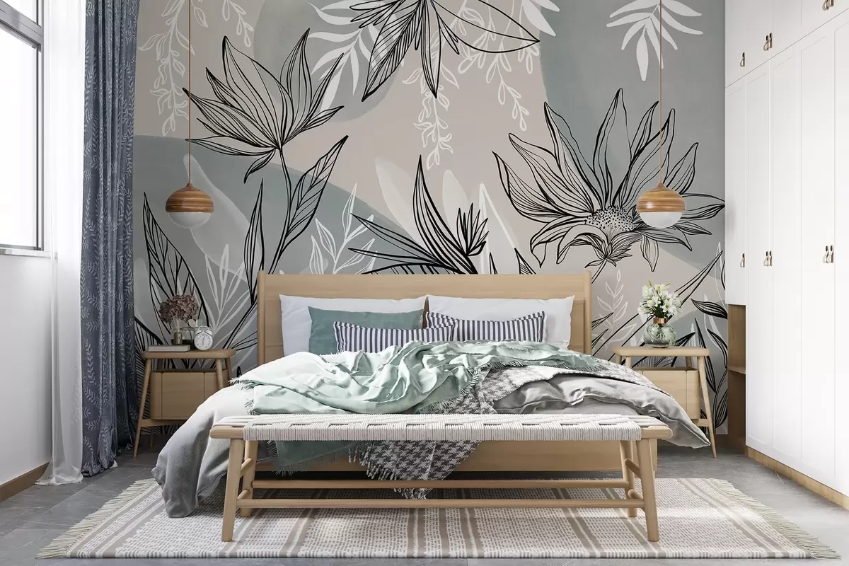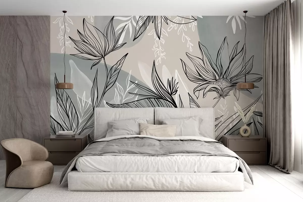 Fotomurales Línea floral con grandes hojas y flores sobre un fondo de acuarela beige y azul Nr. w08865