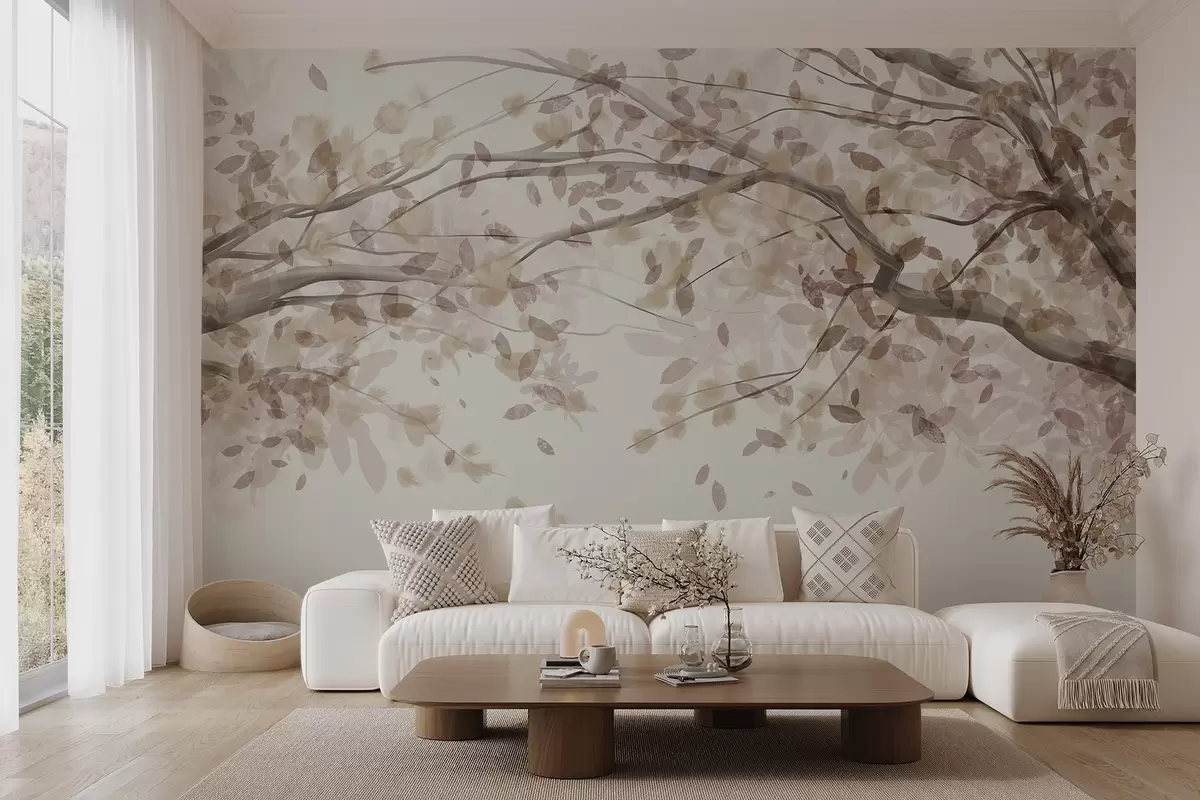 Fotomurales Ramas en flor con hojas beige, colores suaves, detalles delicados, estilo acuarela, sobre fondo claro Nr. w08867v1