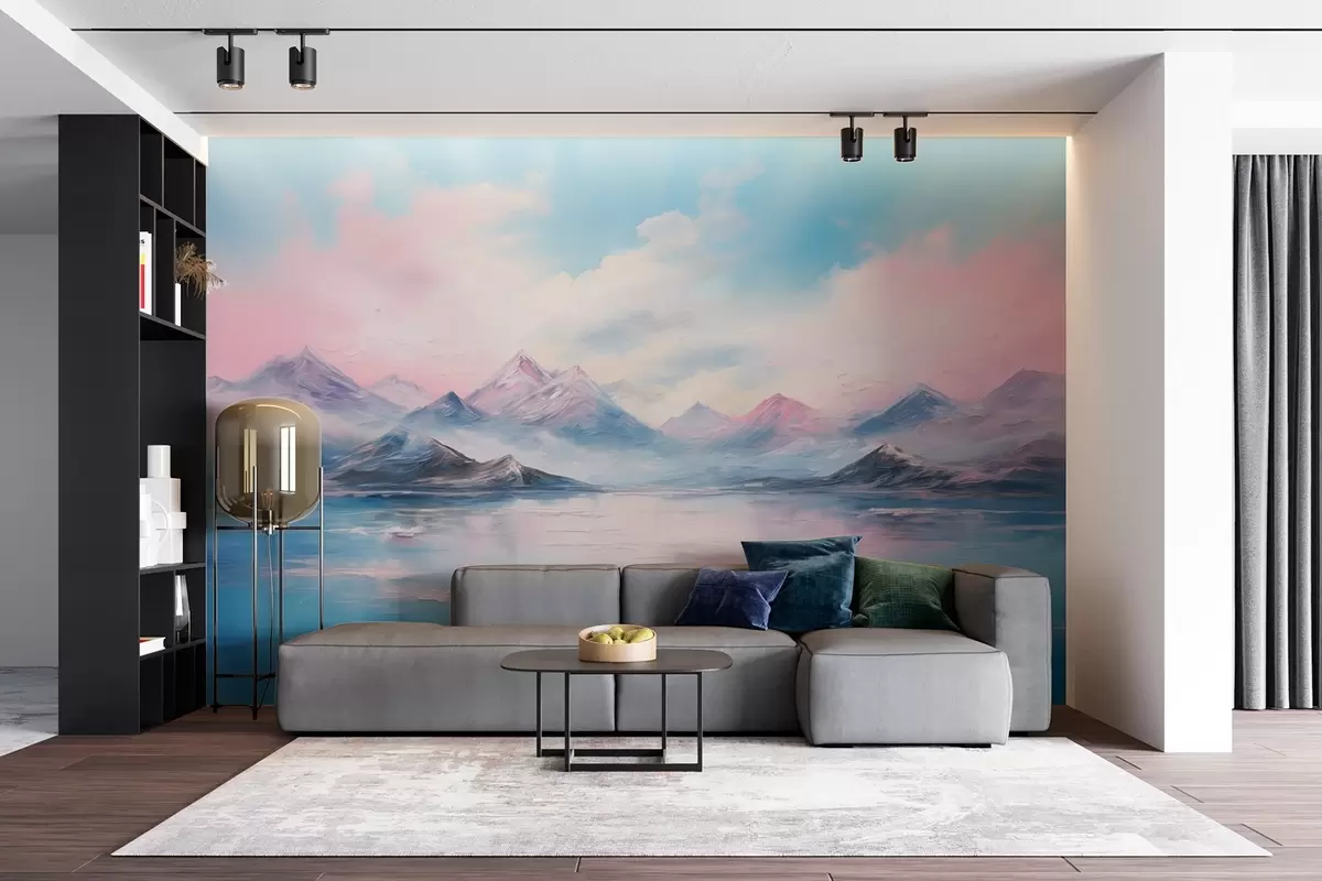 Fotomurales Un colorido paisaje de pinceladas en tonos rosas y azules, con montañas, un lago y nubes Nr. w08878