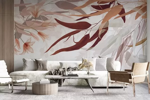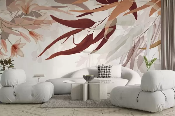 Fotomurales Hojas de eucalipto en tonos bordo, beige y blanco con delicadas flores y ramas sobre fondo blanco Nr. w08887