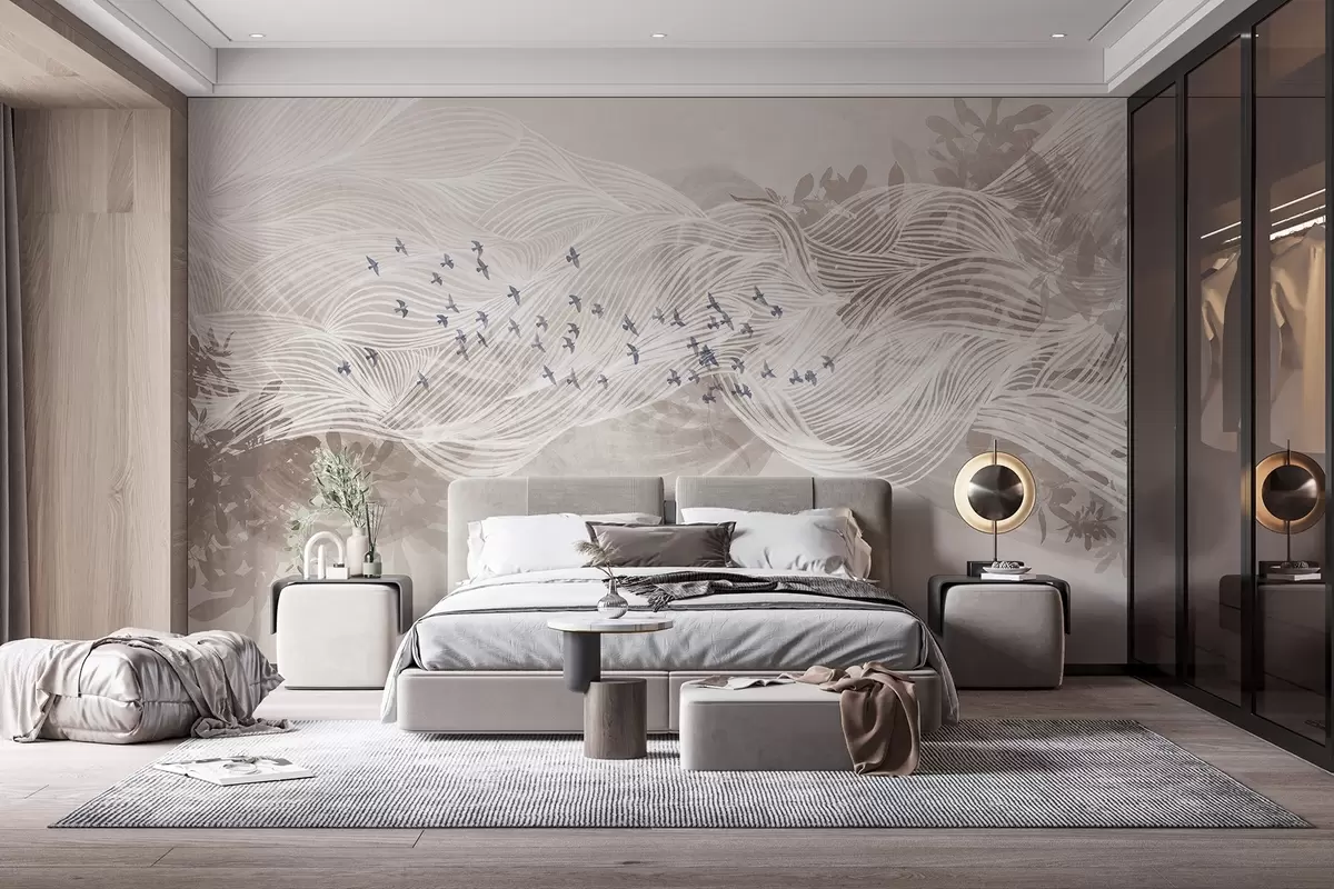 Fotomurales Bandada de pájaros volando sobre el paisaje abstracto de arte lineal ondas de color beige con textura, colores suaves , diseño minimalista Nr. w08898
