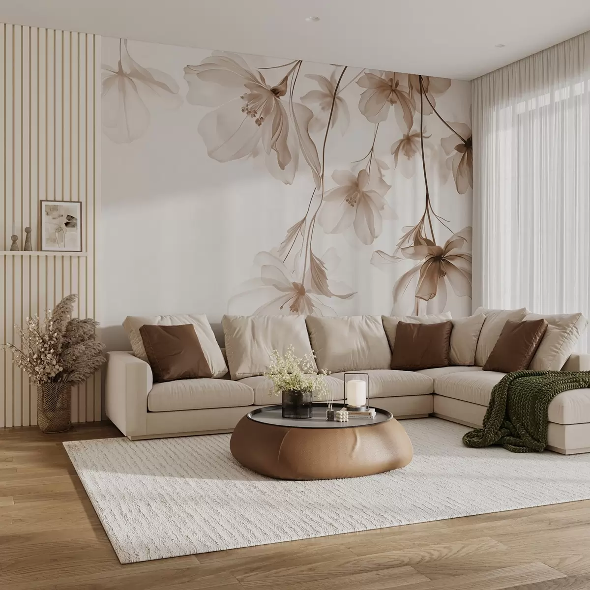 Fotomurales Flores beige con pétalos translúcidos colgando de una rama, beige y blanco, composición minimalista de arte moderno Nr. w08911v1