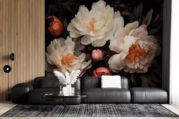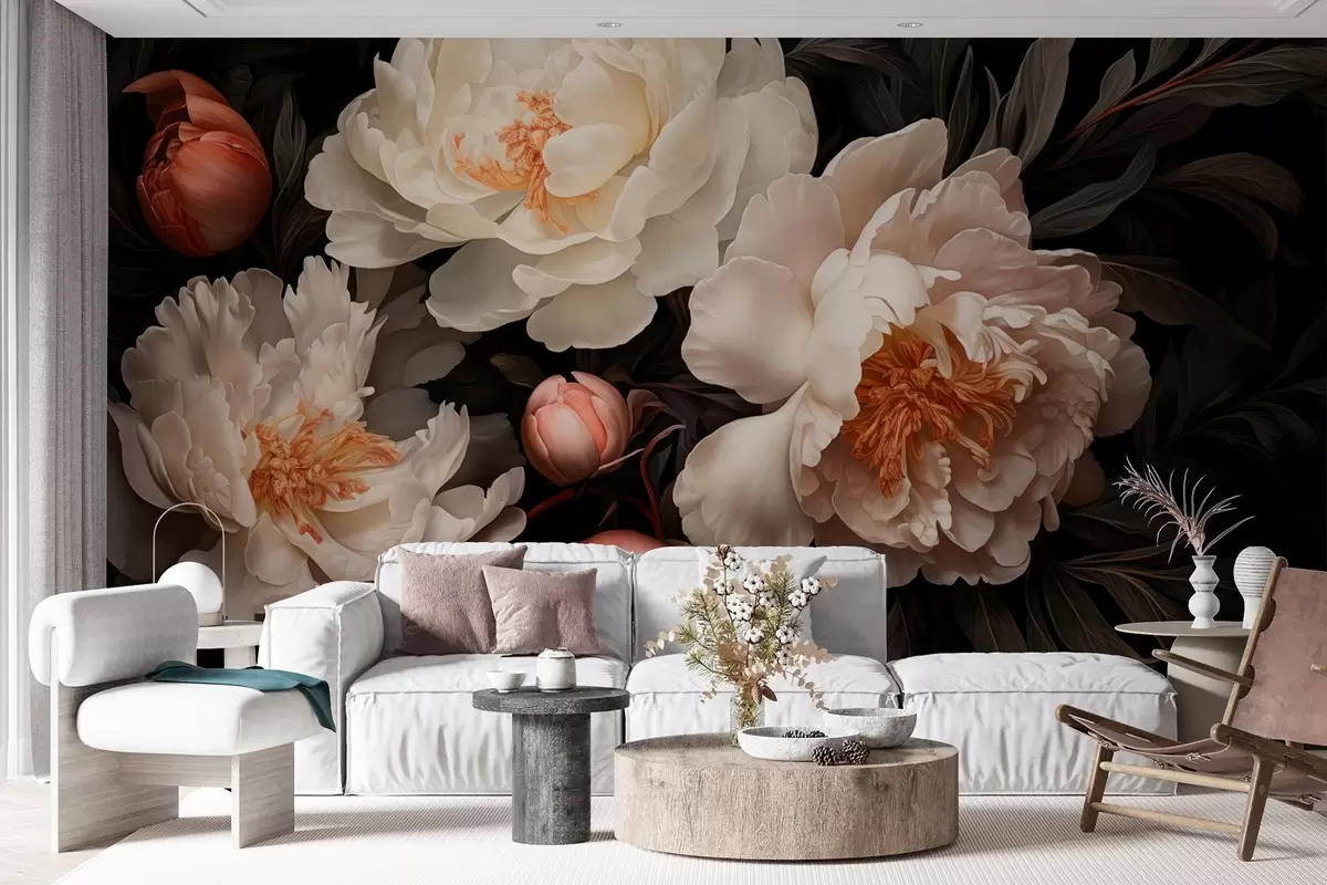 Fotomurales Grandes peonías blancas con capullos rojos sobre fondo oscuro Nr. w08965