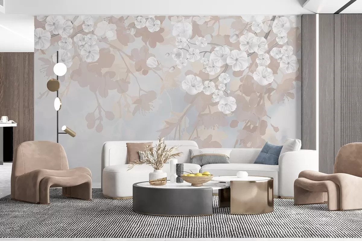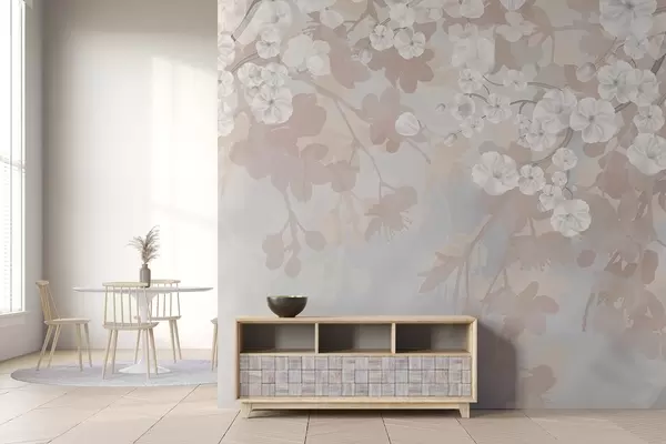 Fotomurales Ramas de cerezo en flor con flores blancas y hojas grises, sobre elegantes siluetas florales en suaves colores pastel Nr. w08973