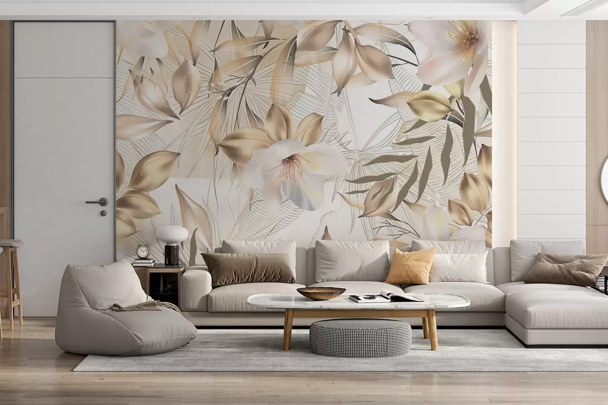 Fotomurales Flores y hojas de jazmín, colores suaves, ilustración botánica, fondo floral , diseño elegante, pétalos delicados Nr. w08977
