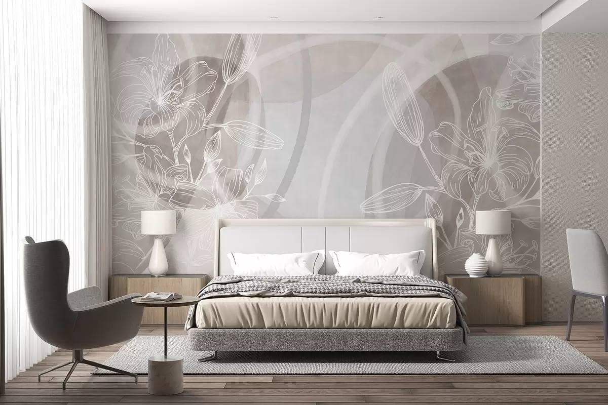Fotomurales Diseño floral minimalista con flores y hojas blancas, círculos abstractos superpuestos en tonos beige y azul Nr. w08979v1