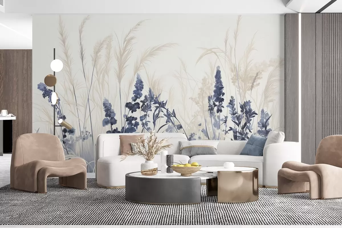 Fotomurales Flores azules y juncos beige en un campo, textura de pintura minimalista, fondo claro, colores suaves, pinceladas delicadas Nr. w08982