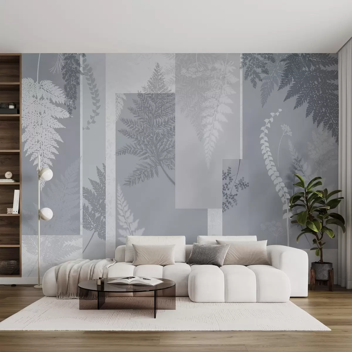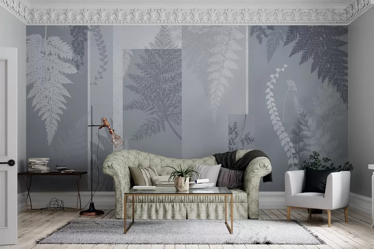 Fotomurales Hojas de helecho en azul y blanco, dispuestas en rayas verticales, creando un estampado botánico y minimalista, de colores suaves y apagados Nr. w09007v1