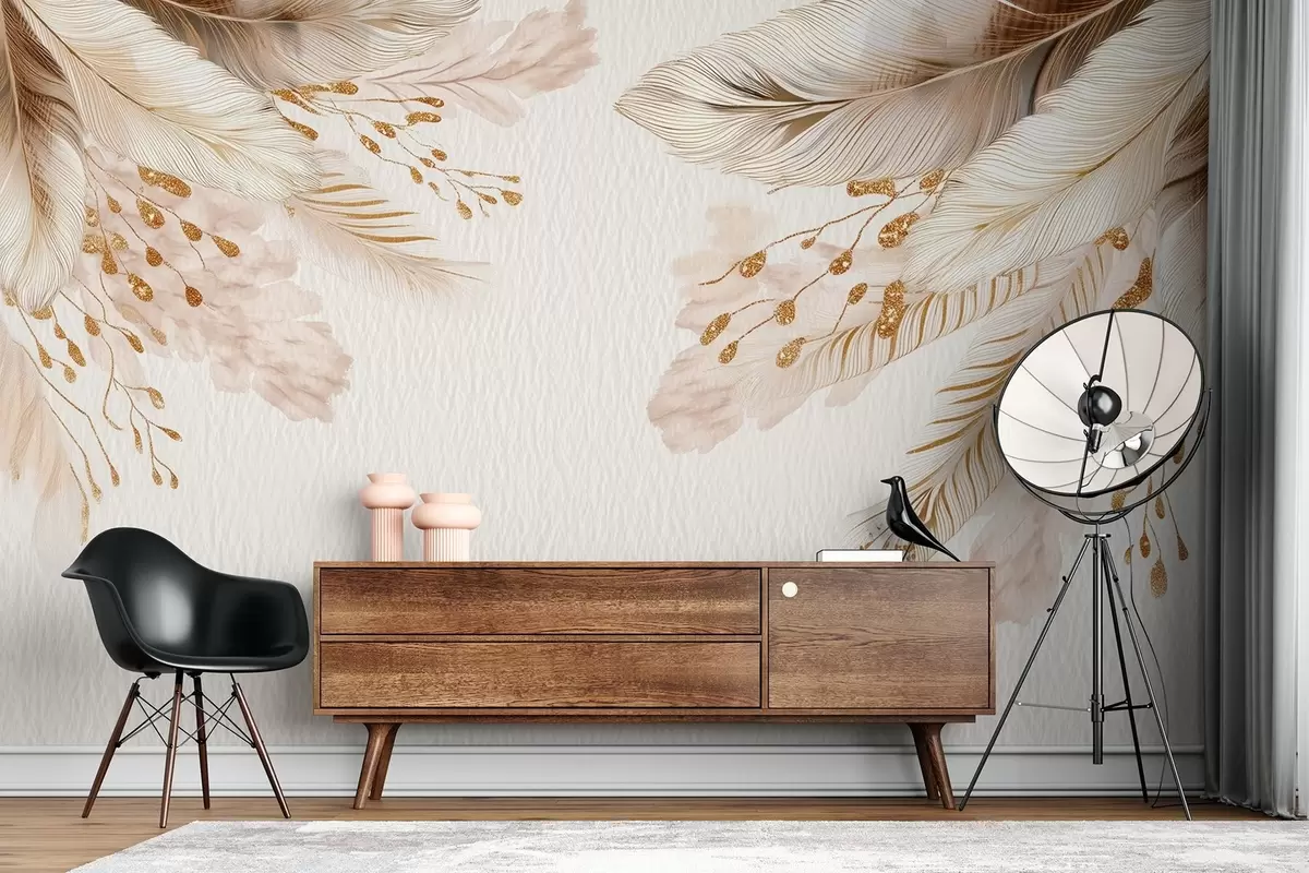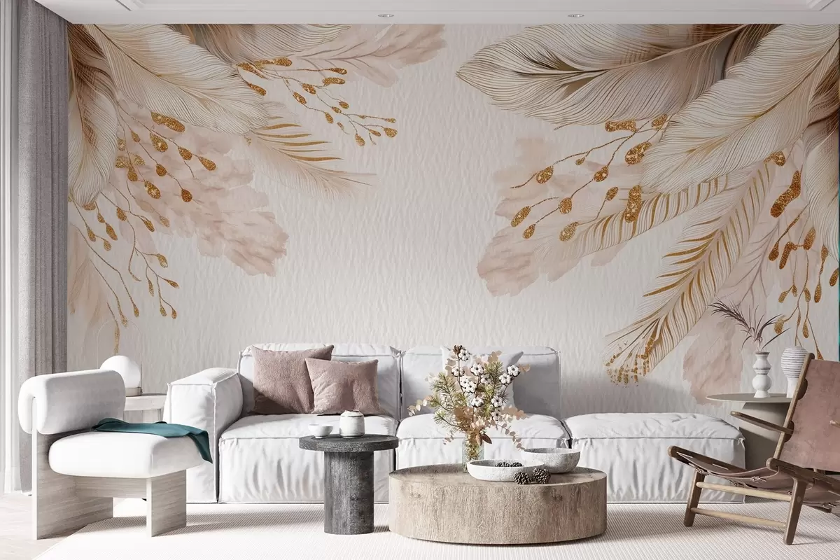 Fotomurales Hierba de las pampas y plumas en estilo acuarela en beige y blanco sobre papel Nr. w09079