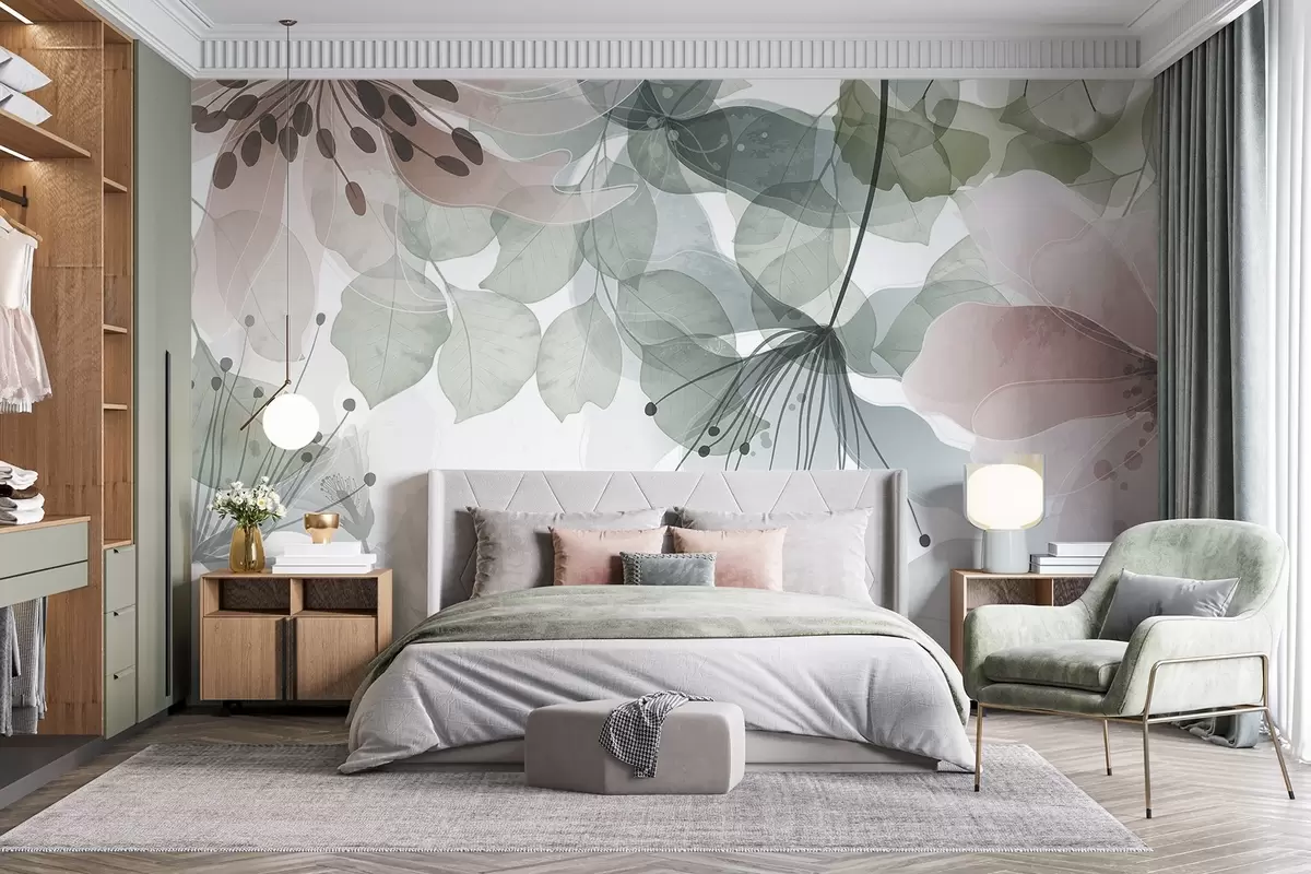Fotomurales Flores y hojas en colores pastel, pétalos y hojas translúcidos, suave efecto acuarela, líneas delicadas, fondo blanco Nr. w09107