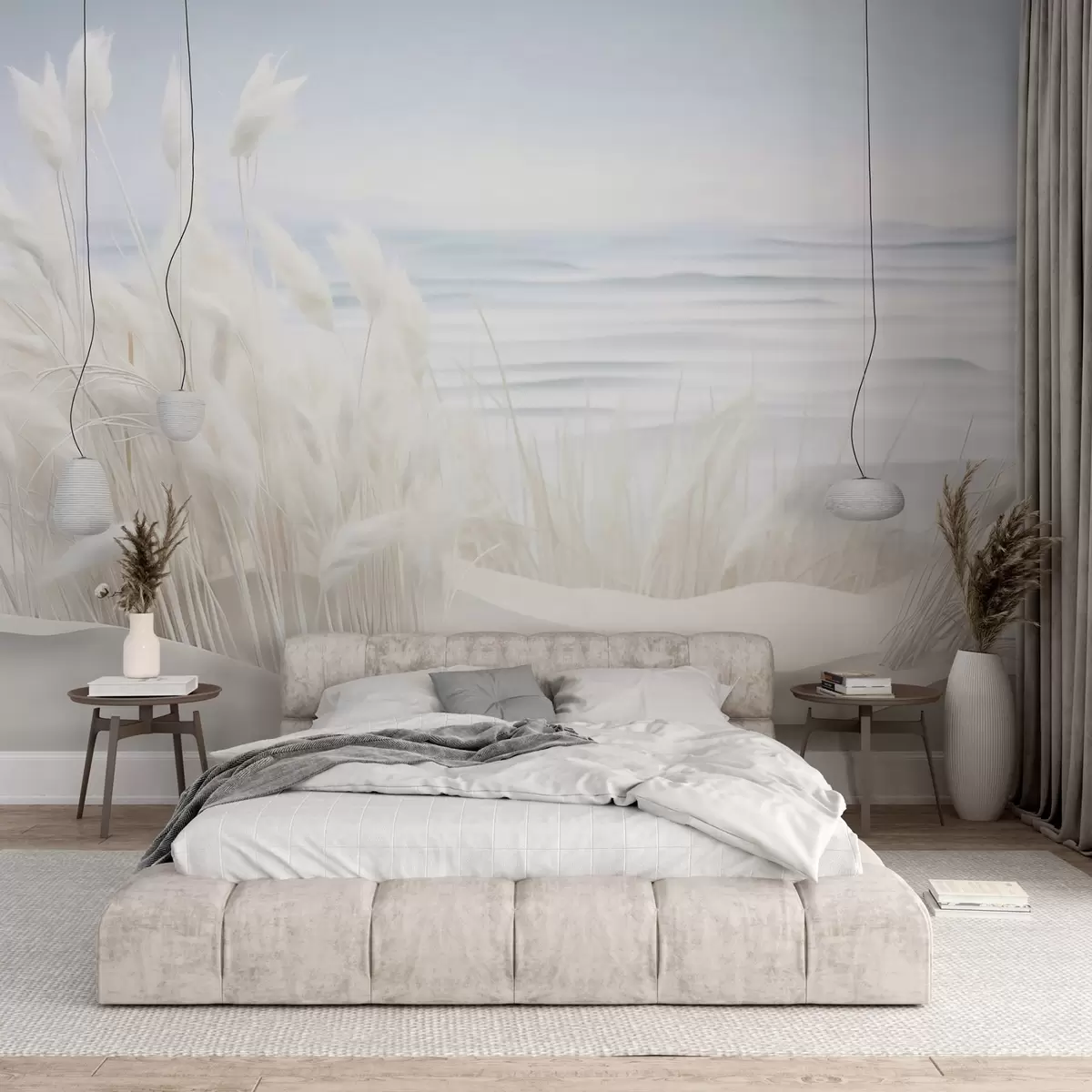 Fotomurales Paisaje con hierba de pampa blanca sobre una duna de arena, con un océano azul claro de fondo, estilo suave y minimalista Nr. w09132