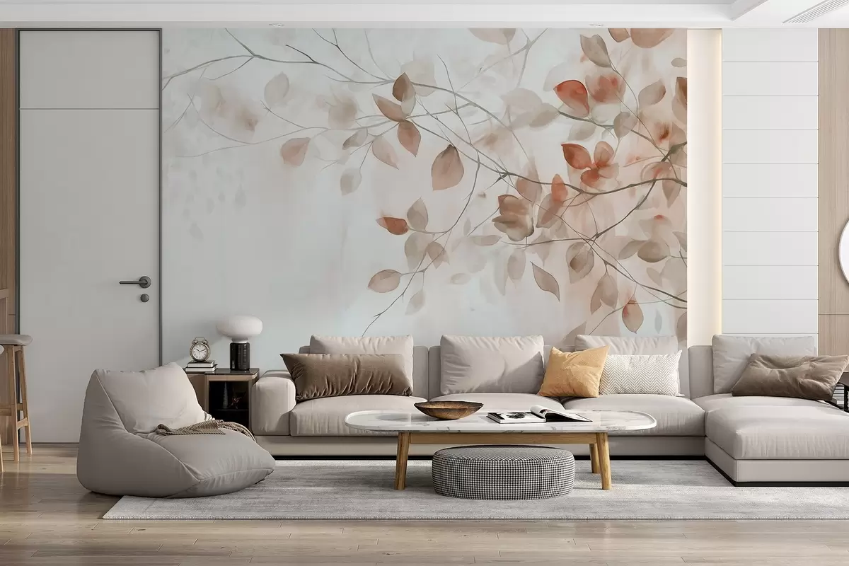 Fotomurales Pintura en acuarela con textura imitando hojas y ramas marrones, colores suaves, detalles delicados sobre fondo blanco Nr. w09133