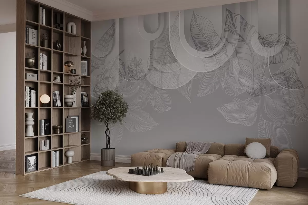 Fotomurales Fondo abstracto con arcos grises y hojas tropicales blancas, diseño minimalista, elegante y moderno, paleta de colores neutros Nr. w09138