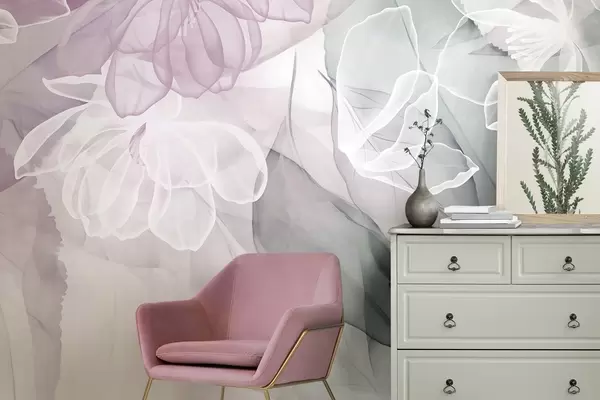 Fotomurales Flores y hojas con pétalos transparentes en tonos blancos, rosas y verdes, suaves y delicados Nr. w09158v1