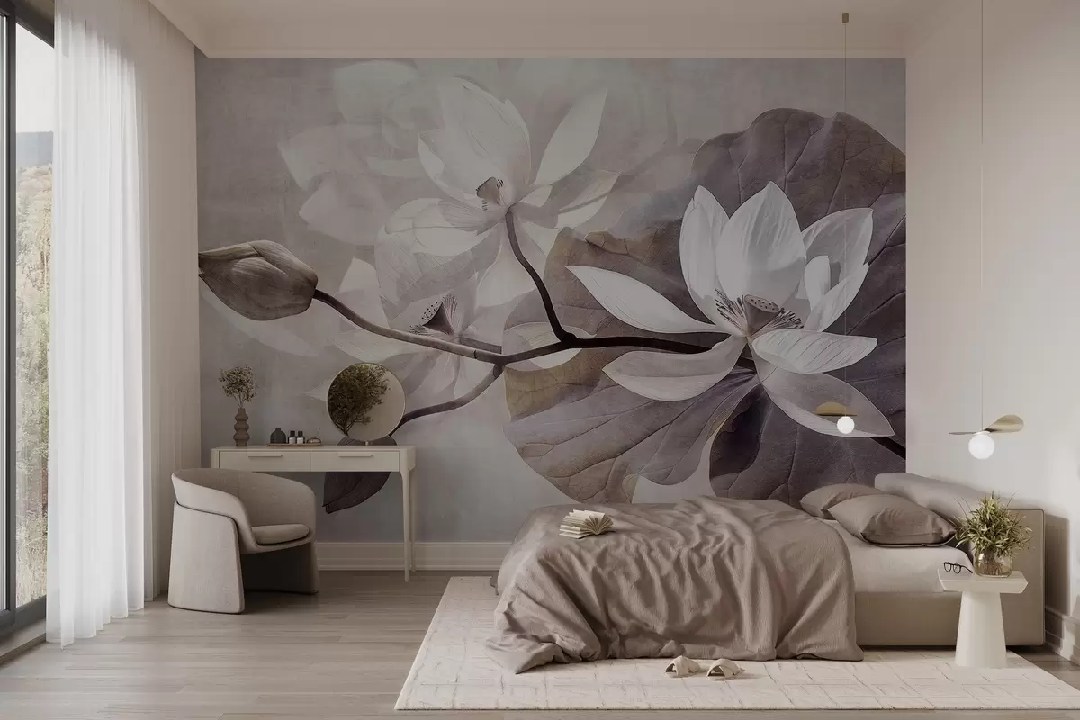 Fotomurales Delicadas flores de loto con hojas y tallos en una suave paleta de colores beis Nr. w09159
