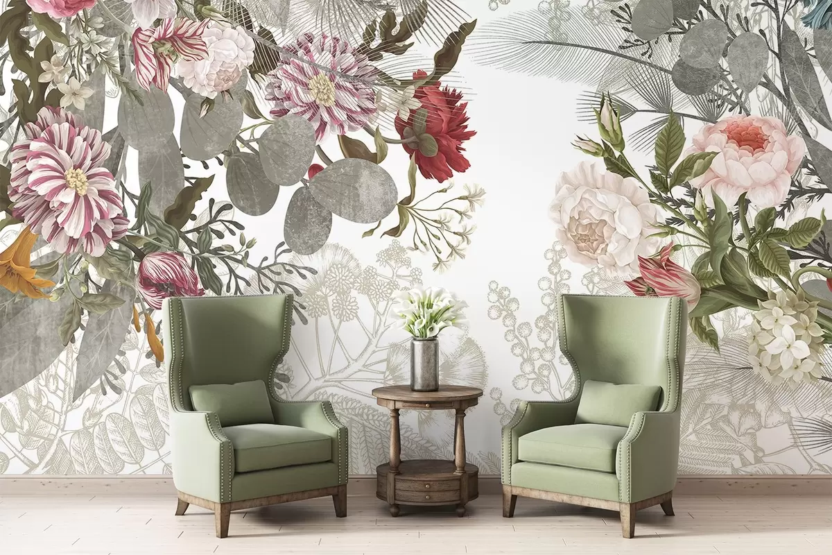 Fotomurales Arreglo floral vintage con rosas, eucalipto y mimosa en tonos verde apagado, rojo y rosa Nr. w09164v1