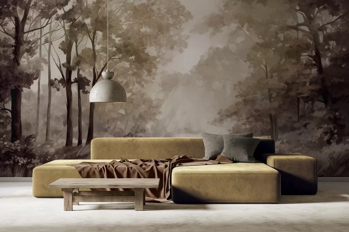 Fotomurales Paisaje forestal texturizado, árboles con hojas beige y marrones, paleta de colores pastel Nr. w09210