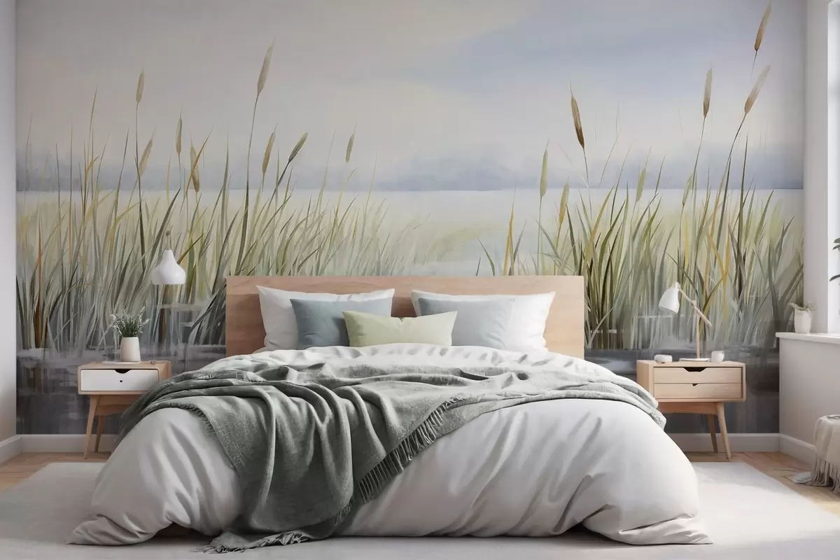 Fotomurales Una acuarela textura pintura imitación de paisaje con lago, hierba, cielo nublado y fondo borroso Nr. w09219