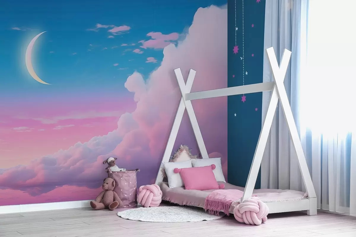 Fotomurales Mágica puesta de sol con nubes y luna creciente en tonos rosas y azules Nr. w09240