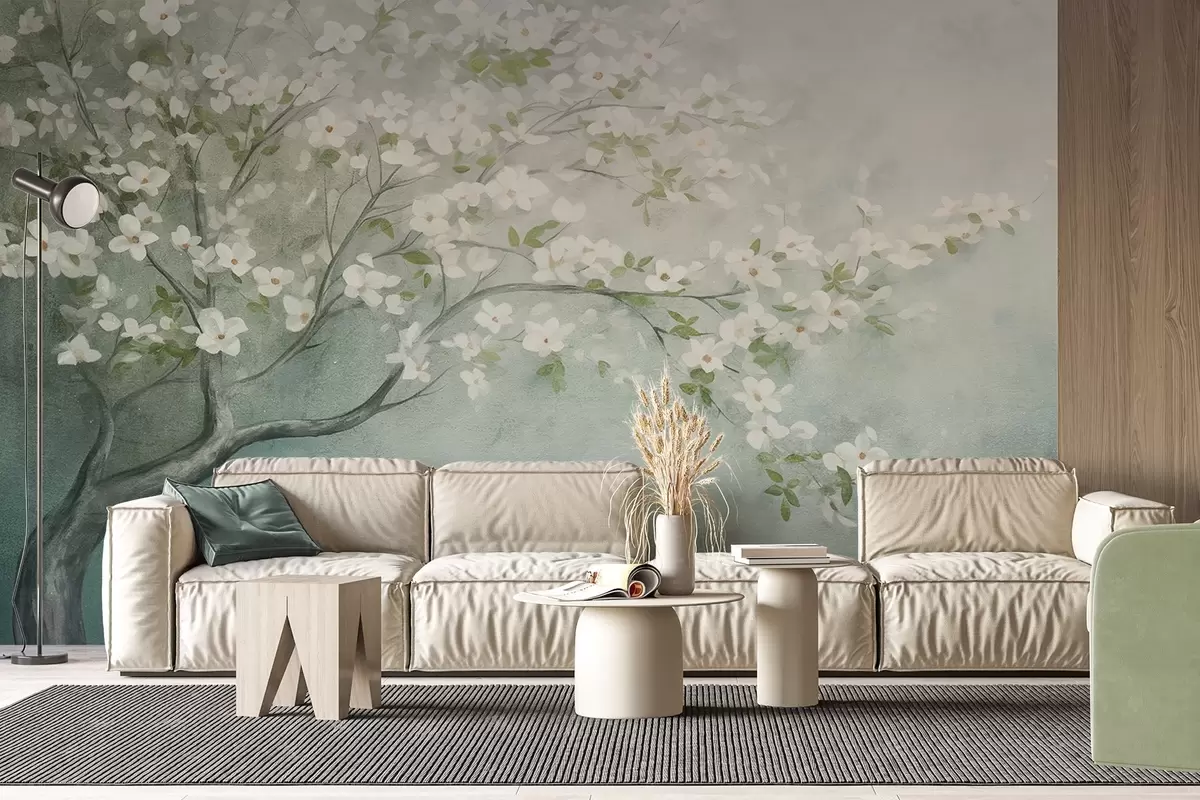 Fotomurales Un árbol en flor con flores blancas en plena floración, sobre un fondo granulado de textura ruidosa de azules y verdes apagados Nr. w09261