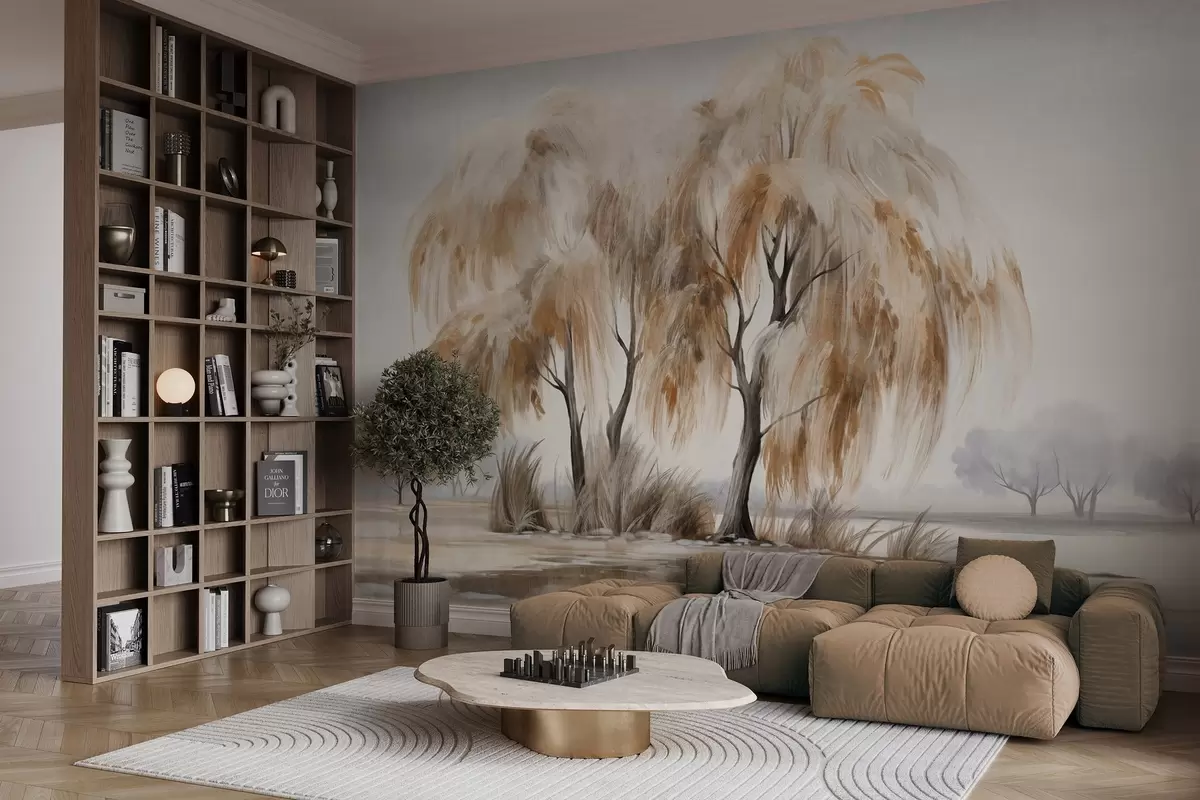 Fotomurales Sauces texturizados con hojas marrones y blancas en la orilla de un lago, con algo de hierba a su alrededor, en un día brumoso Nr. w09268