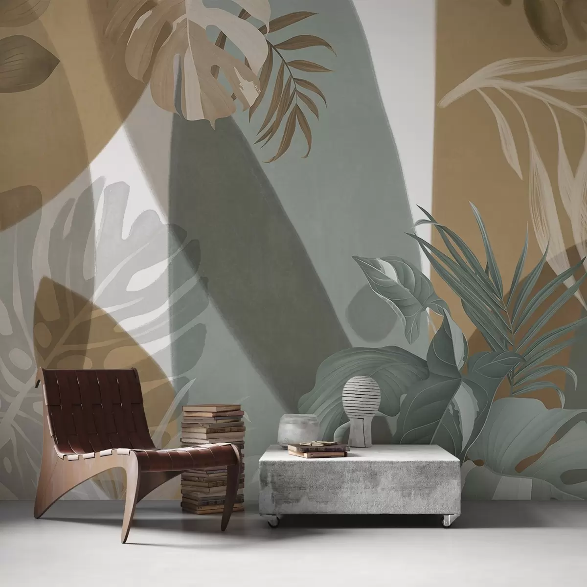 Fotomurales Hojas de Monstera y hojas de palma en un patrón con colores marrón, blanco y verde, ambiente tropical, formas abstractas, decorativo Nr. w09288